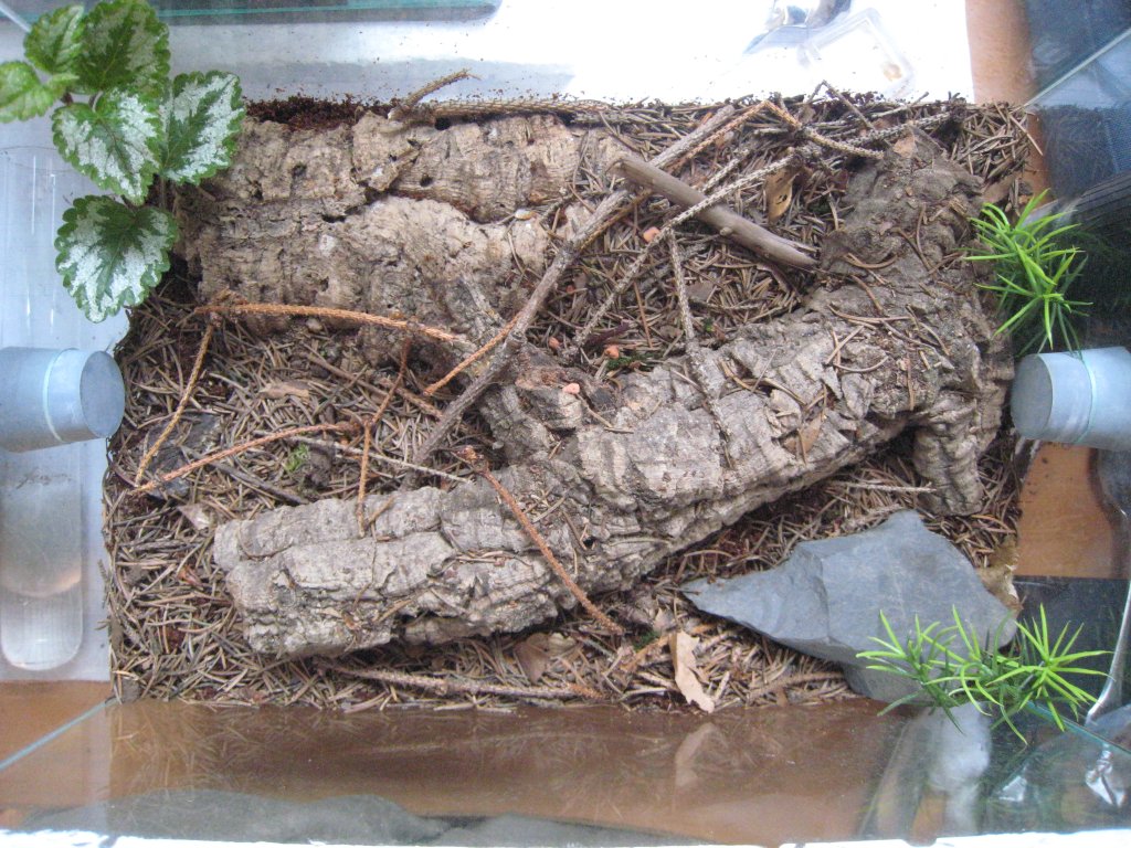 Dann kam die restliche Deko hinzu: Eine Korkrinde zur Nesterweiterung (sie scheinen Holz zu mögen