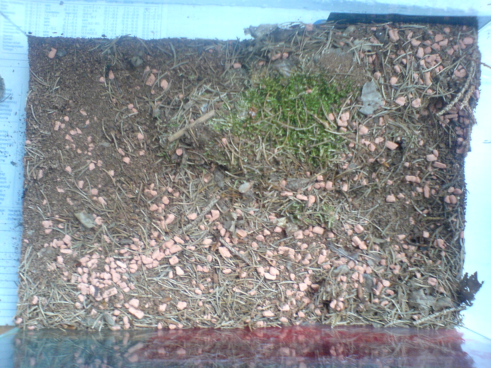 Danach habe ich das frische Substrat einfach überall drüber gekippt. Viel mitbekommen haben die Ameisen dabei nicht, bis auf die Tatsache, das die Eingänge zu waren.
