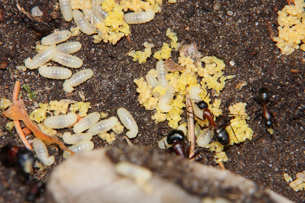 Camponotus ligniperdus legt nur 2x im Jahr Eier, und zwar im Frühjahr und im Herbst, wobei die Herbstbrut als kleine Larven im Ruhestadium überwintern und im kommenden Frühjahr hochgezogen werden.
