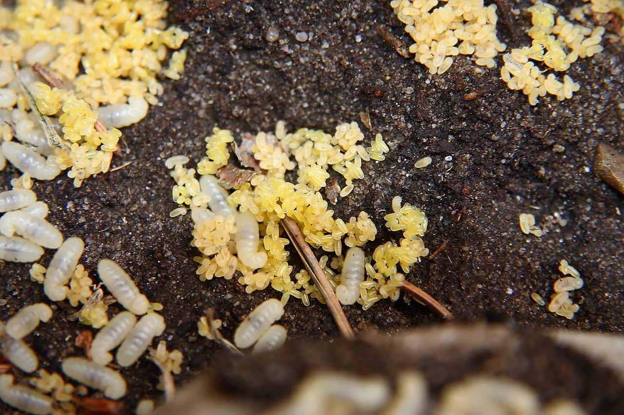 Zuerst legt die Königin binnen weniger Tage ein komplettes, großes Gelege, aus denen innerhalb 2-3 Wochen die Larven schlüpfen.