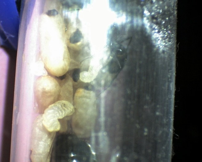 Im Nest kann ich immer mehr neue Larven erkennen, während die Eierzahl langsam schwindet - das liegt wohl am schubweisen Gelege, für Nachschub ist jedenfalls gesorgt und die nächste Puppe beginnt sich zu verfärben.