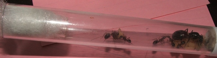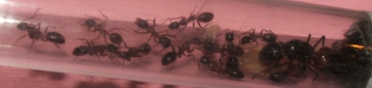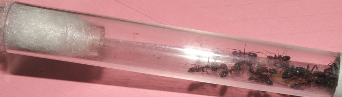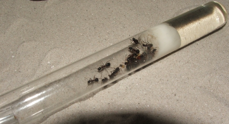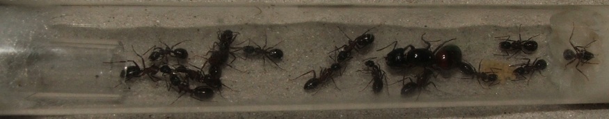 Bei einer Zählung der Ameisen kam ich auf 16 Arbeiterinnen und knapp 20 Larven, die Kolonie scheint sich also wieder gefangen zu haben!