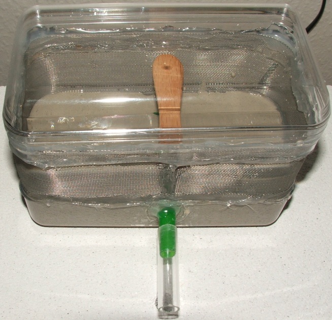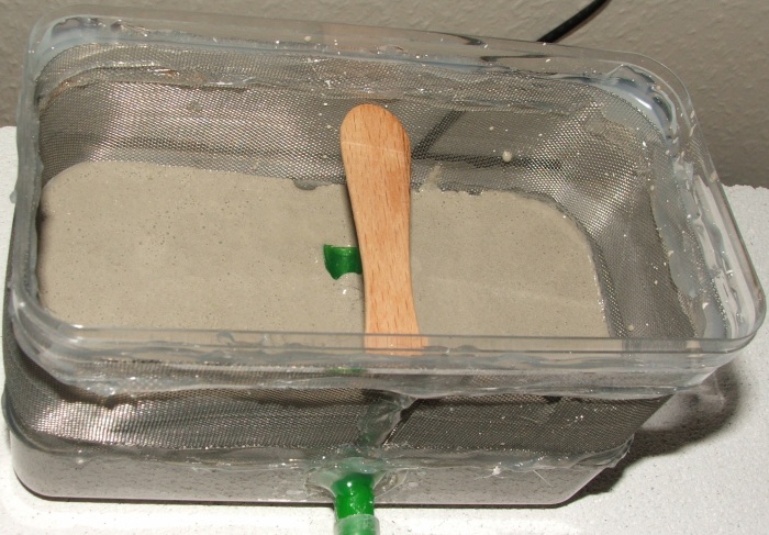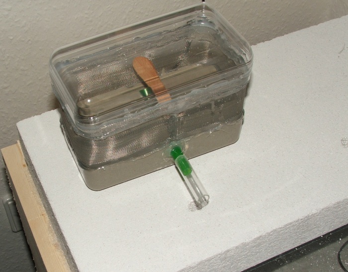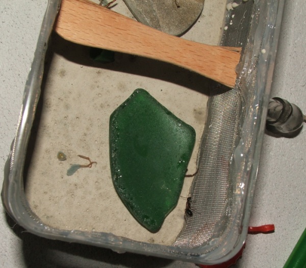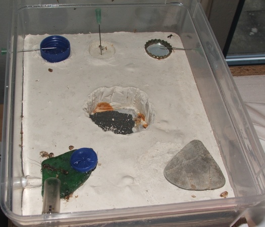 Hier mal die Innenansicht, Zugang von unten in den Gips/Zementboden (hoher Gipsanteil), der Eisstiel hällt die Wände etwas nach außen, damit sich zwischen Deckel und Dose keine Lücke für die Ameisen bilden kann!