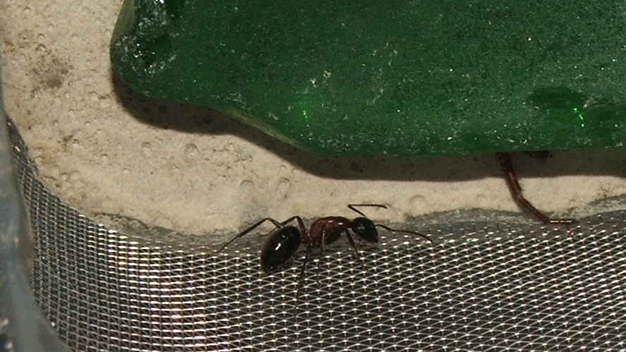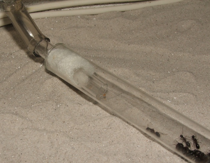 Die letzte Nacht lief eine Arbeiterin scheinbar unendlich suchend in der Arena herum, auch ein zurücksetzen in den Zugangsschlauch der Arena veranlasste sie nicht dazu, zurück ins Nest zu ziehen und den Wattestopfen, der sie aufhalten sollte, wieder zurückzugehen, brachte sie nicht zur Einsicht...