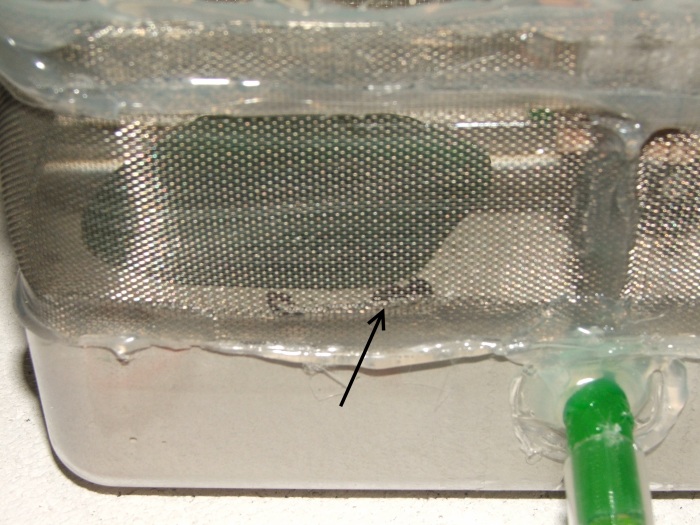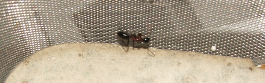 Zunächst wollte ich nur auf Verdacht einen neuen Heimchenschenkel hineinlegen, beim Öffnen des Deckels fand ich auf dem Lüftungsgitter eine Arbeiterin!