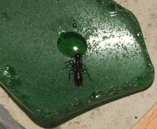 Zu sehen ist die Arbeiterin unter der Königin, sie hat sich schon gut vollgefressen, um als Speicher für die Kolonie zu dienen - raus will sie jetzt bestimmt noch nicht, wie man erkennen kann, ist sie noch nicht völlig ausgehärtet.