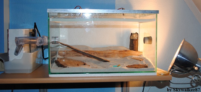 Im Deckel befinden sich zwei blaue LED-Lichter, um die dämmerungs- und nachtaktiven nigriceps auch dann noch sehen zu können. Mittags bis abends strahlt eine 40 Watt-Lampe seitlich ins Glasbecken und heizt dieses auch auf.