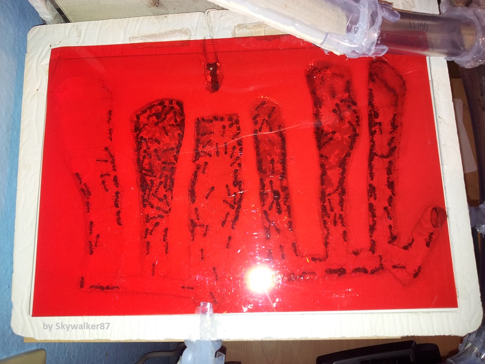 Die Kolonie hat meines Erachtens nun eine Größe erreicht, bei der man ihr etwas mehr Laufweg in die Arena zutrauen kann. Bisher waren es 30cm Schlauch vom Nesteingang zur Arena.