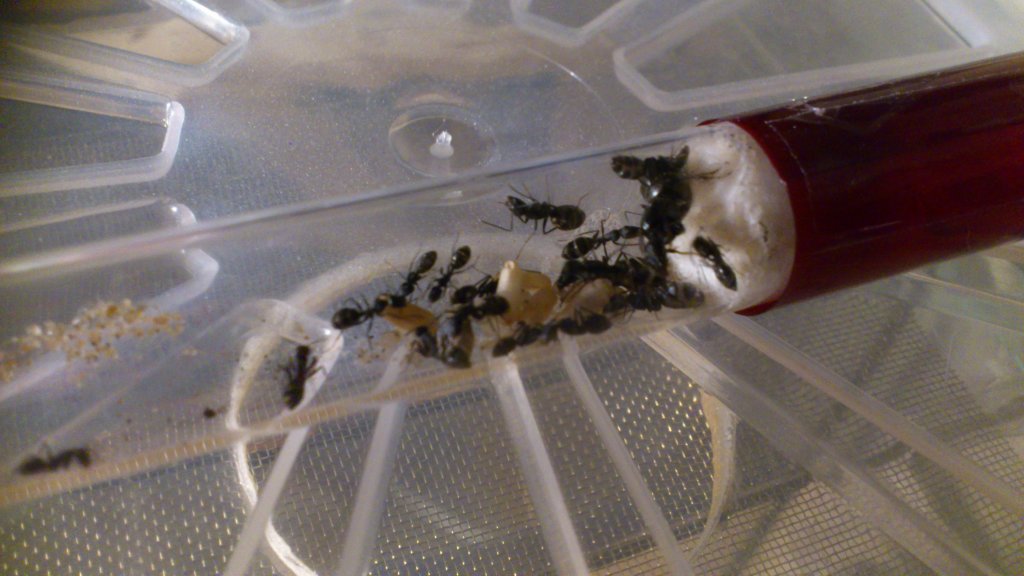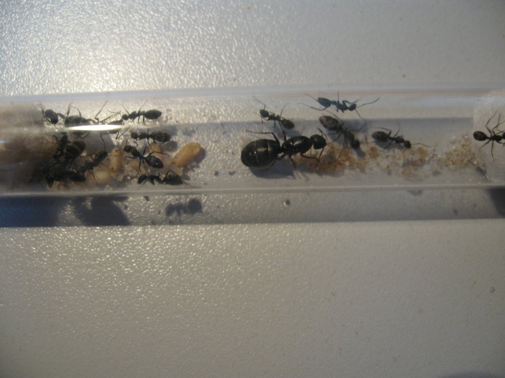 So hatten die Kleinen keinen Stress beim Transport und ich konnte sie gleich in Augenschein vor Ort nehmen. Ich entschied mich schließlich für eine gut 16 Individuen + Königin starke Kolonie, da ich einerseits nicht unbedingt die heikle Gründungsphase gleich zum Einstieg haben wollte, jedoch andererseits die Kolonie von Beginn an verfolgen will. Man kann sagen ein Kompromiss