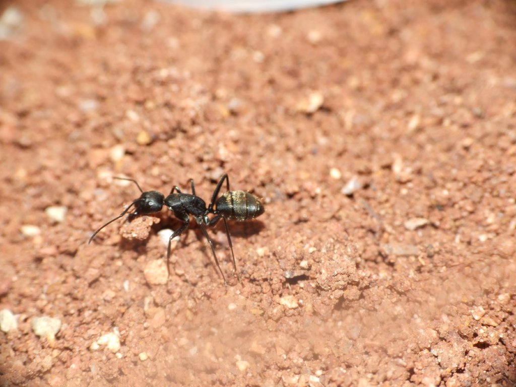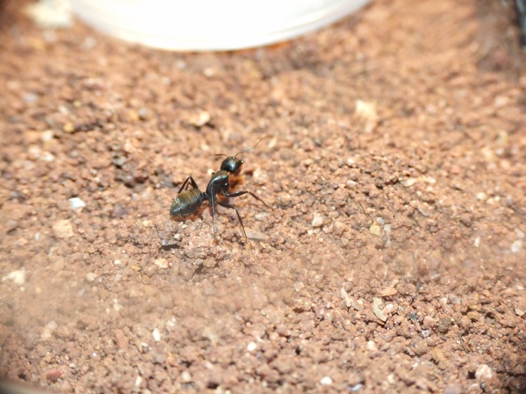 Nur eine Arbeiterin ist draußen und optimiert und modelliert noch den Nesteingang. Was ich jetzt so von ihnen gesehen habe, machen Sie mir einen recht agilen Eindruck. Auf den ersten Blick sehen sie einfach nur schwarz aus, aber bei näheren hinschauen kann man einen goldenes Schimmern auf dem Gaster erkennen. Wenn ich sie mit einer anderen bekannten Ameisenart vergleichen würde, fällt mir da Camponotus pennsylvanicus. Sie sehen dieser recht ähnlich.