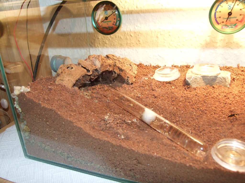 Sie haben sofort angefangen unter der Korkrinde ein Erdnest auszuheben. Heute waren dann auch alle aus dem Reagenzglas verschwunden und ins Erdnest eingezogen. Und jetzt ist erstmal Ruhe, so wie es sich für Camponotus auch gehört :D