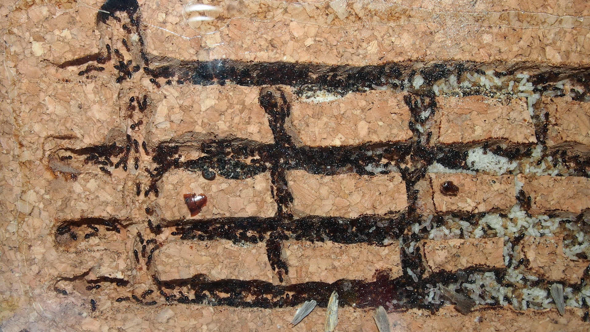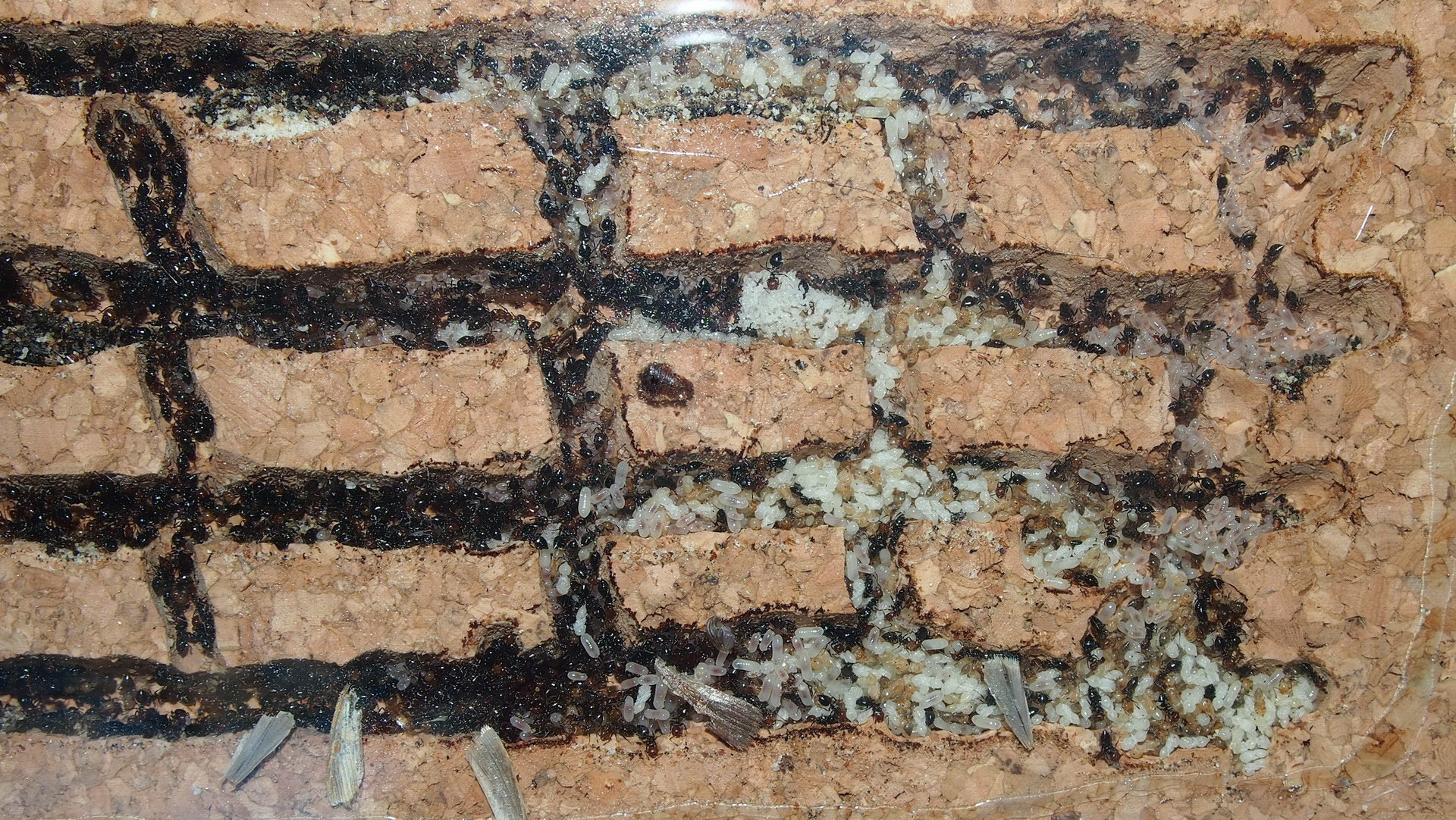 Paraffinöl hält sie momentan sehr erfolgreich ab. Von den Arbeiterinnen, die sich außerhalb des Nests aufhalten, sind an den Scheiben eh nicht so viele, die meisten sind am Boden bzw. auf dem Nest.