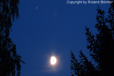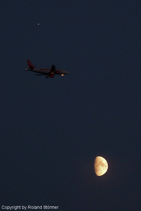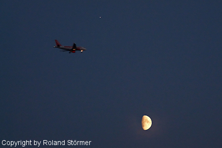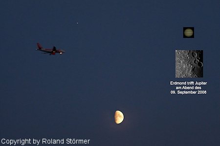 Am Abend des 09. September 2008 war es wieder mal soweit. Unser Erdmond näherte sich bis auf etwa 4 Grad dem Gasplaneten Jupiter. Der zunehmende Mond ist zu 71% beleuchtet. Aufgenommen von Unna-Königsborn (NRW) aus. Das Flugzeug im Bild befand sich gerade im Landeanflug auf den Flughafen Dortmund-Wickede.
