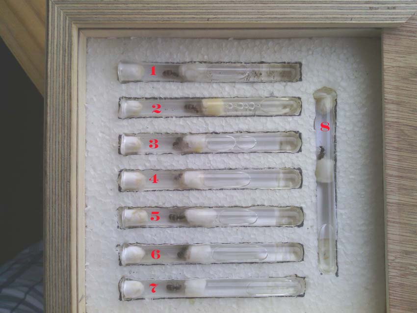 In den letzten Jahren scheiterte ich immer daran, dass ich zwar die Königinnen dazu bringen konnte, Eier zu legen und ihre Brut aufzuziehen, aber spätestens nach ein paar Wochen trockneten Ytong-Nester aus, das Wasser im RG wurde aufgebraucht, und konnte nicht rechtzeitig erneuert werden etc. oder die ganze Kolonie starb aus mir unerklärlichen Gründen, sei es durch Stress oder andere Einflüsse.