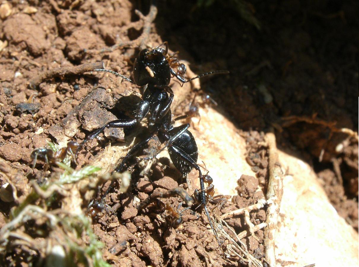 Die riesigen haarigen und durch und durch schwarzen Vertreter der Formicinen lebten, so kam es mir vor, in wirklich jedem sonnenbeschienenem Stück Holz auf dem Boden. Allerdings am häufigsten riesige Kolonien.