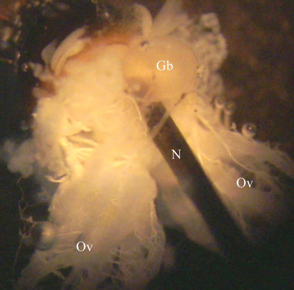 Hinweisstrich 3: Ist ein kleiner Teil des „Fettkörpers“, Fettzellen, die zwischen allen Organen liegen. Der war bei beiden Königinnen gut entwickelt, das heißt, dass die Tiere „gut im Futter“ standen. Der Fettkörper sieht im Auflicht (Präpariermikroskop) weiß aus, hier im Durchlichtmikroskop erscheint er grau, weil das von unten einstrahlende Licht nur schwach durchdringt. Dieselbe graue Tönung würde eine Spermafüllung im Receptaculum bewirken. Aber das ist hier (1) fast durchsichtig, so wie die Umgebung des Präparats.