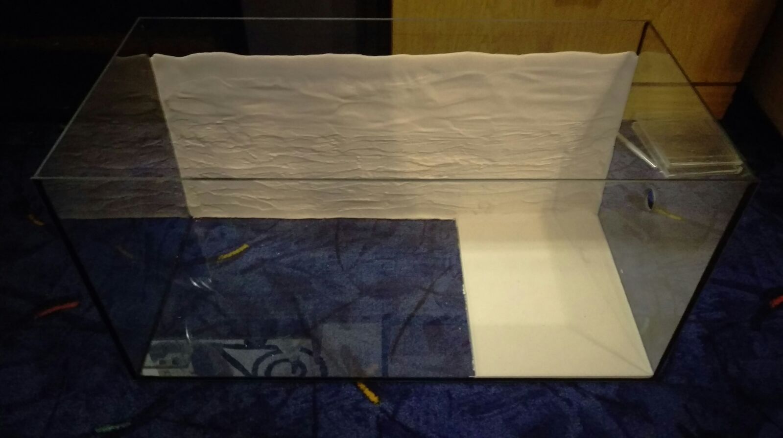 Nachdem der Gips trocken ist das Aquarium wieder richtig hingestellt und den niedrigen Teil des Bodens aus Gips gegossen.