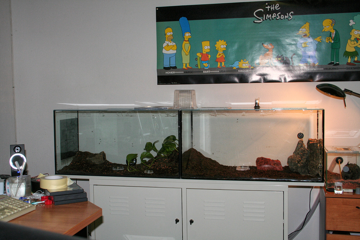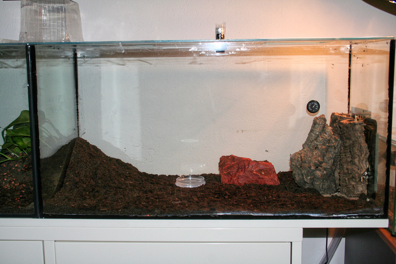 Damit bewohnt meine Kolonie 5 Monate nach Kauf nun 2x 80x35x40 plus 2x 30x20 inklusive 3 Meter Schlauch, zwei Heizmatten, 2 Lüfter und eine Lampe. Verfüttern muss ich im Monat ca. 400-600 Heimchen.