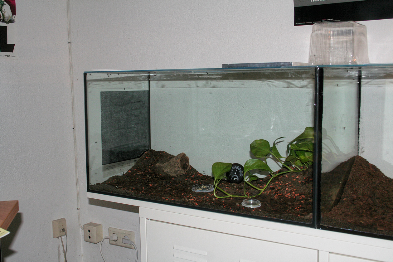 Heute hatte ich endlich mal Zeit mich um das leidige Problem mit dem Müll und den toten Ameisen zu kümmern. Ich habe die Plastikhaube am zentralen "Übergang" ausgetauscht mit einem 30x20er Becken und an dieses Becken mittels ~3 Meter Schlauch ein weiteres 30x20 Becken angeschlossen. Ich bin immer aufs Neue erstaunt wie viele Ameisen sofort zur Stelle sind wenn ich etwas verändert habe. Da bei mir aber nie etwas so klappt wie ich es mir vorstelle ist natürlich noch keine einzige Ameise in den 3 Meter Schlauch geklettert, es ist einfach jedes mal eine Freude zu sehen, dass diese Art nie so reagiert wie erhofft. :? Natürlich werde ich mich erstmal in Geduld üben und falls morgen noch immer keine Bewegung im Schlauch ist werd ich ihn mühsam abschrauben und einen Hanfstrick durchziehen...