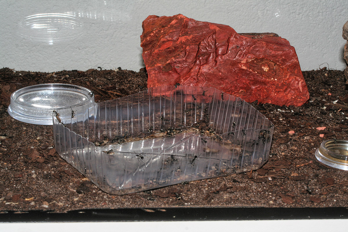 Kurzes Update: Das Müllbecken wird doch nicht mehr so gut akzeptiert, es sind inzwischen so viele Ameisen in dem kleinen Becken, dass auch dieses nicht mehr als Leichenplatz genutzt wird. Habe jetzt eine grosse Glasschale mit Wasser integriert, einige Leichen werden dort reingeschmissen.