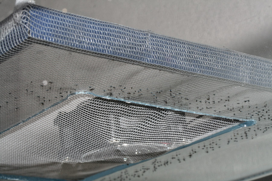 Irgendwie habe ich das Gefühl, jedes Mal wenn ich schreibe, hat die Aktivität wieder zugenommen. Ich habe seit mehreren Tagen keine Milben mehr gesichtet, das ist schonmal super. Die Kolonie wird immer dreister und aggressiver, zu Anfang als ich den neuen Plexiglasdeckel gebaut habe hat sich nie eine Ameise drunter gewagt, sie liefen immer nur an den Scheiben. Inzwischen reicht es, wenn ich eine der Luken öffne oder einer der Lüfter angeht und mutige Ameisen krabbeln in Richtung Luftzug. Spätestens am Ölfilm scheitern sie überkopf natürlich und plumpsen runter. Leider oft in die Honig oder Wasserschalen, nun muss ich also auch noch aufpassen, wo ich diese platziere. Wenn ich mit den Händen im Becken arbeite, habe ich das Gefühl sie lassen sich absichtlich runterfallen. Jedenfalls geht keine Aktion mehr ohne blinde Passagiere auf den Händen oder Armen, zum Glück krabbeln sie nur und beissen nie. :mrgreen: Auch zu beobachten: Durch die massive Präsenz in allen Ecken der Becken haben sie keine Angst mehr. Früher hat es gereicht, eine Ameise mit der Pinzette anzustubsen und sie sind geflohen, haben ihre Beute oder tote Arbeiterinnen liegen gelassen. Jetzt machen sie das (leider) nicht mehr.