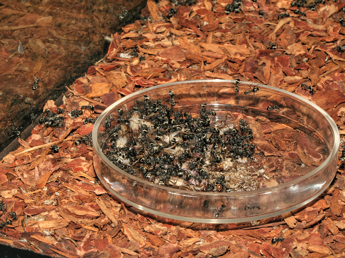Ich bin immernoch nicht dazu gekommen, das Becken wieder einzurichten, die Äste die ich zugeschnitten habe sind noch in der Abstellkammer, man hat mir gesagt wenn ich sie direkt in die Becken lege treiben sie eventuell aus, das will ich nicht. Ich habe das Futter etwas umgestellt, füttere jetzt nicht mehr nur Heimchen sondern einen Mix aus Terflys, Goldfliegenlarven und Heimchen. Wie merkt man, dass man nicht zu viel füttert? Wenn über Nacht die Futterschale bis auf den letzten Krümel leergefressen wurde. ;) Sie lassen einfach nichts mehr zurück.... Am Nest wird immernoch ständig ausgebaut, einfach nur super zuzuschauen. Die grosse Wasserschale ist plötzlich jeden Tag komplett ausgetrocknet, da ich die Strahler nicht in ihrer Position verändert habe vermute ich, dass die Kolonie plötzlich enormen Durst hat. Könnte vielleicht auch an der trockenen Heizungsluft liegen aber negative Effekte auf die Kolonie konnte ich noch nicht feststellen.