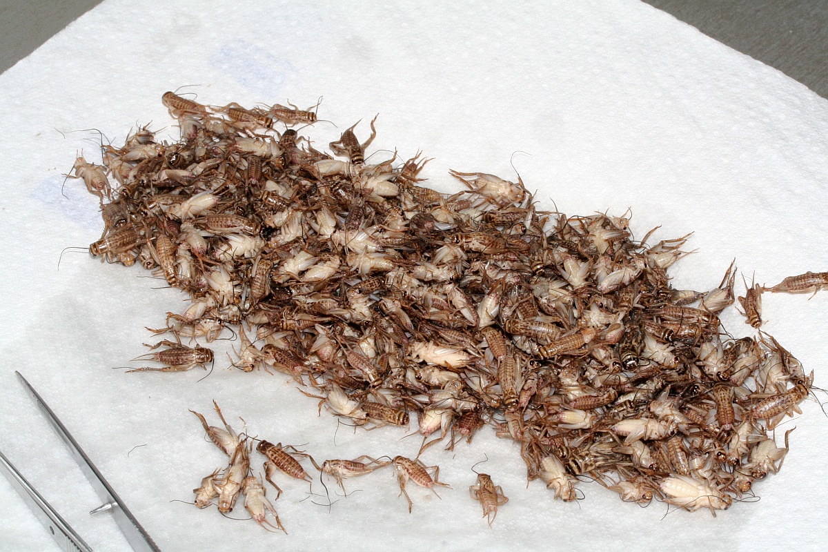 Ich kaufe immernoch einmal pro Woche frische Futterinsekten, kurz ins Eisfach damit sie gelähmt sind, dann in ein grosses Glas geben und abkochen. Danach friere ich sie ein, länger als eine Woche sind sie aber nie in der Gefriertruhe.
