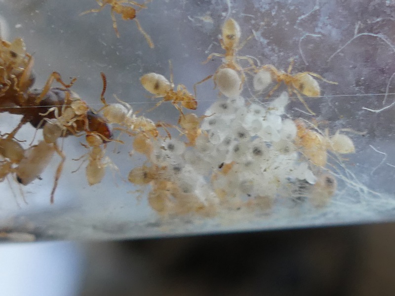 Sie fand das Ei der Lasius niger Königin und dachte es wäre ihr eigenes.