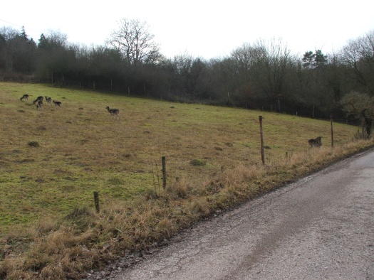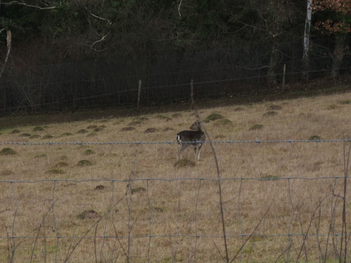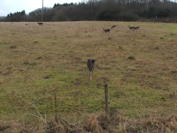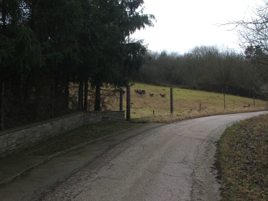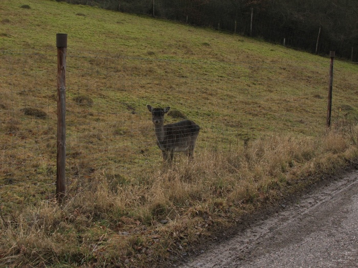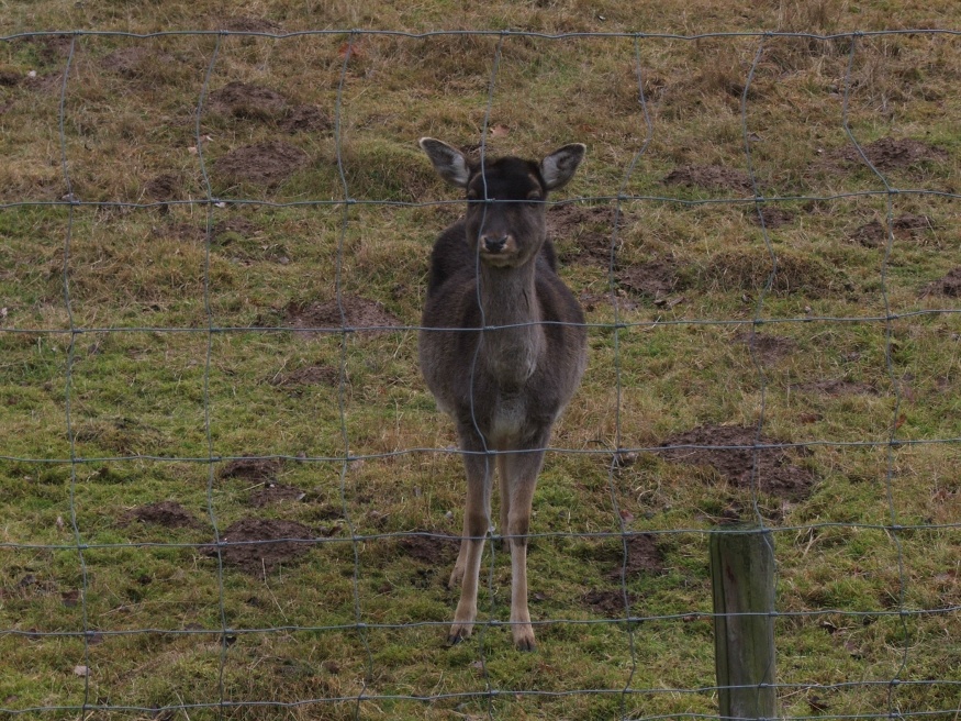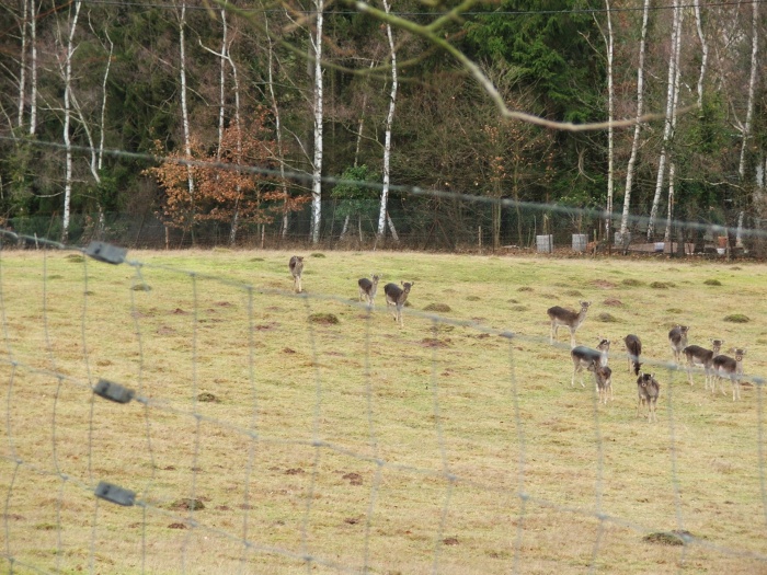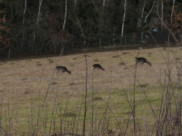 PS: Das werden wohl Europäische Damhirsche (mit dem schönen lateinischen Namen Dama dama) auf der Weide sein. Sie sehen nur so grau aus, da die Hirsche noch ihr Winterfell tragen.