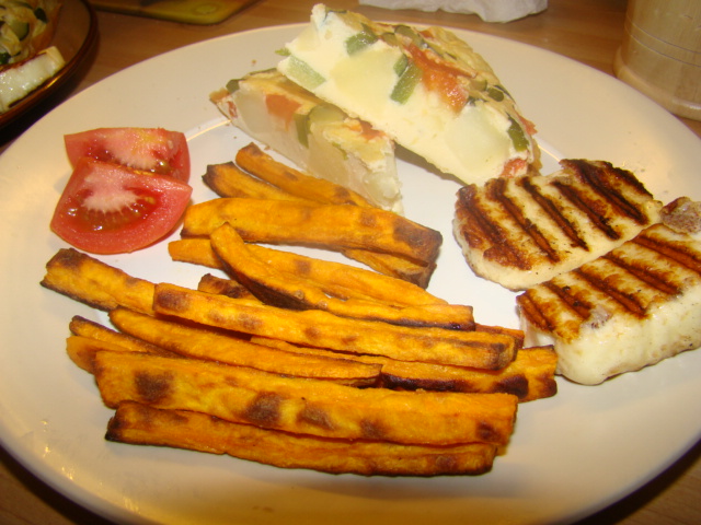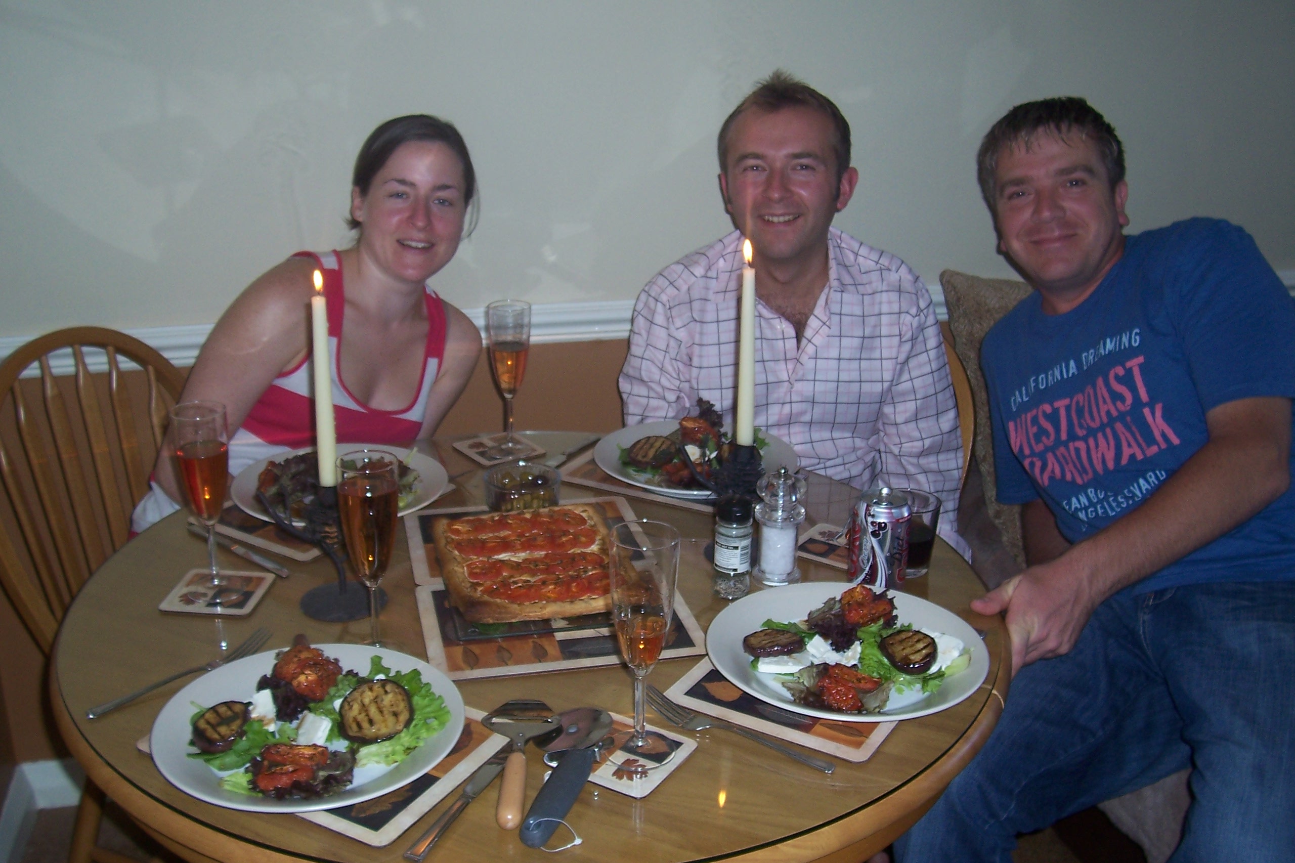Anyways im babbling on here far too much the following we have : a chargrilled aubergine and slow raosted plum tomatoe salad with crumbled feta cheese and mixed tender tip leafs drizzled with a balsamic and galic oil dressing, accompanying a slow raosted tomatoe home made flacky pastry tart on a bed of goats cheese with garlic and thyme ... this isnt just food, its Darran cooked food.... (lol only the Ukers will get that bit)