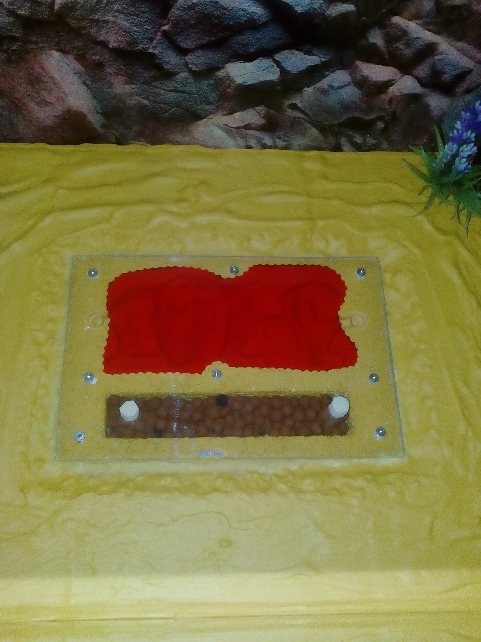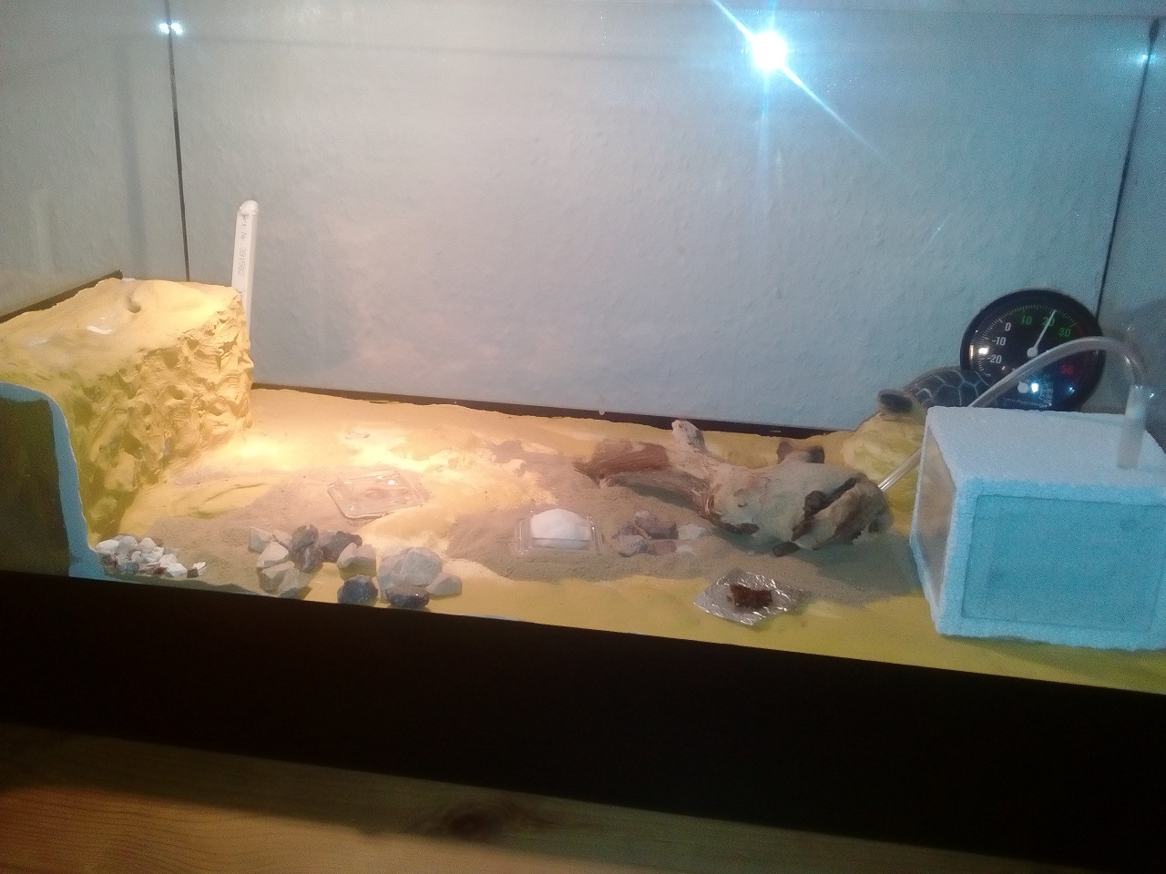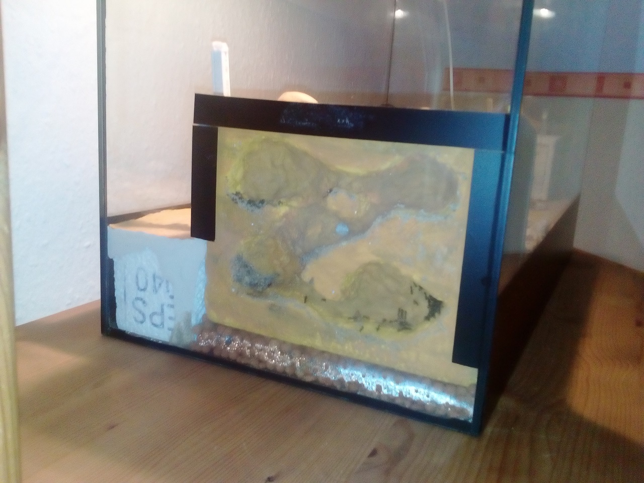 Ich habe mich einen kompletten Tag durch alle Foren gewühlt und alle Infos zum Bau wie ein Schwamm aufgesaugt. Ich wollte meine zukünftigen Schützlinge nicht in einem Reagenzglas halten das war klar also ab auf Kleinanzeigen und erst mal ein Aquarium für nen zehner geschnappt. Am nächsten Tag ging es zu Hornbach um alles was ich am Abend zuvor auf meine Liste geschrieben habe zu besorgen. Samstag Mittags ging es los. Leider habe ich versäumt damals Fotos zu schießen bzw. war ich auch viel zu sehr in meinem Element und hatte keine zeit Fotos zu machen :D . Nachdem der Bau soweit abgeschlossen war sah das ganze dann so aus.
