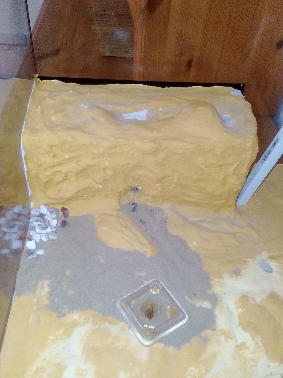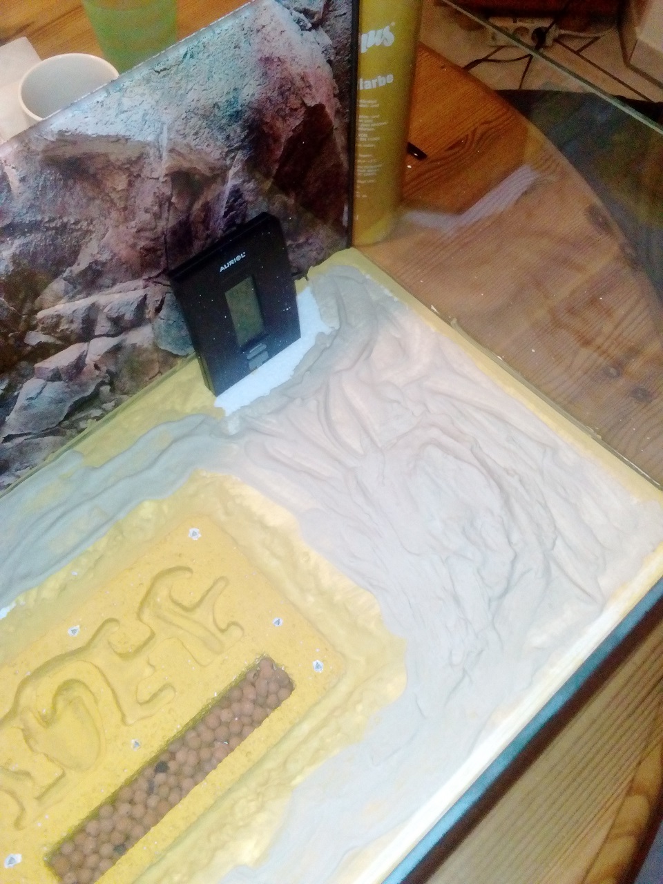 Zu guter Letzt habe ich jetzt noch Sand als dünne Schicht aufgetragen und das ganze mit der Wurzel aus dem alten und ein paar Steinchen Dekoriert.
