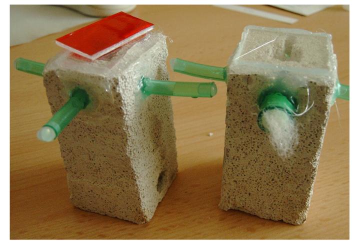Durch die kleinen Schläuche kann die Gründungskönigin einerseits hineingehen, später können dort andererseits Säfte, wie Zuckerwasser verfüttert werden (in der Mitte der untere Schlauch enthällt als Beispiel etwas Leitungswasser), die Oberflächenspannung hällt die entsprechende Flüssigkeit dank der Stopfen dann zurück.