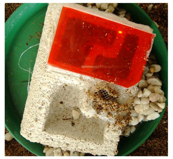 So kommen zwar Arbeiterinnen durch, aber die Königin ist dafür einfach etwas zu "massiv", sie unt teilweise noch etwas Brut müssen also unter Begleitschutz von Arbeiterinnen im Ytong bleiben, wo ich sie gut beobachten kann (rote Folie kann man abnehmen).