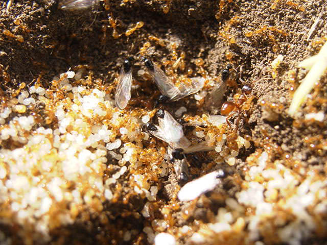 Man beachte bei den Arbeitern den auch zu den Männchen gewaltigen Größenunterschied. Auf einem Bild ist rechts ein rubra Arbeiter zu sehen, der leider Gottes ins Nest gerannt ist
