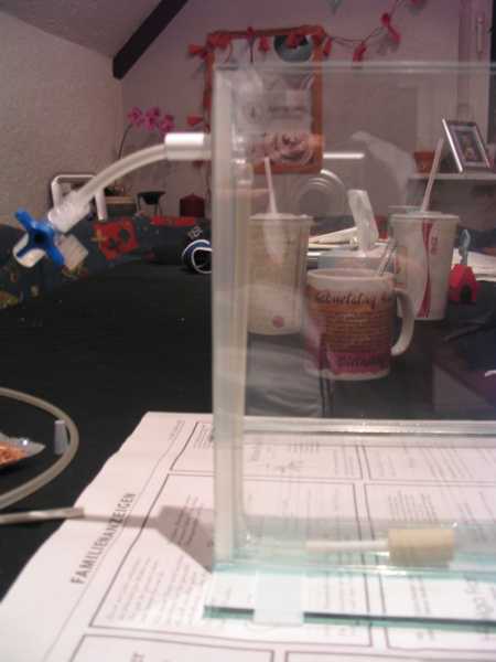 Bestehend aus einem Aquarium-Luftschlauch, 2 passenden 90° Bögen, einem Belüfterstein (seitlich etwas schmaler gefeilt) und einem 3-Wege-Ventil (aus dem Krankenhaus für Infusionen).