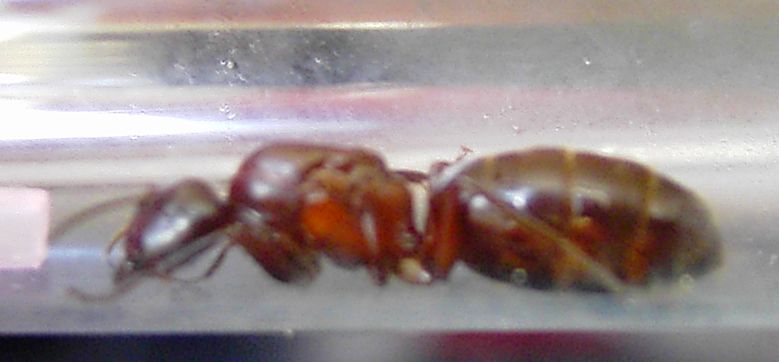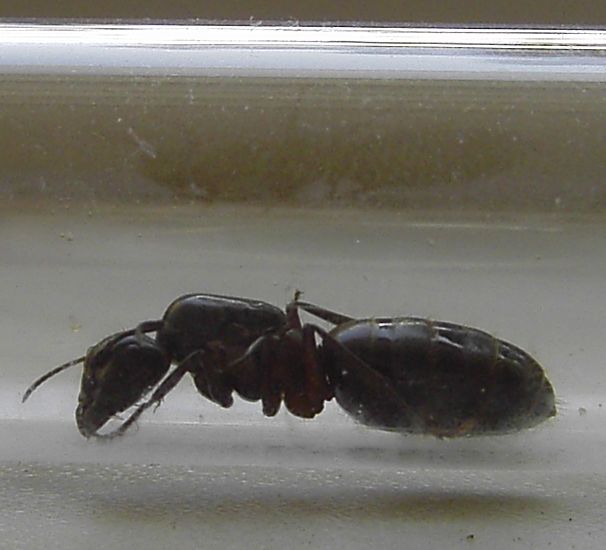 Vor ein paar Tagen ist mir auf einem Spielplatz eine relativ große Ameise über den gepflasterten Weg entgegen gelaufen (im Süden von Baden-Württemberg). Hatte zufällig ein Glas dabei :D und hab sie gefangen. Vermute mal sehr stark, dass es eine Königin ist. Nur was für eine... Sie ist ca. 16mm lang, wobei alleine der Gaster 7-8mm lang ist und ca. 4mm breit. Von oben wirkt sie komplett schwarz, von der Seite allerdings im mittleren Bereich leicht rötlich.