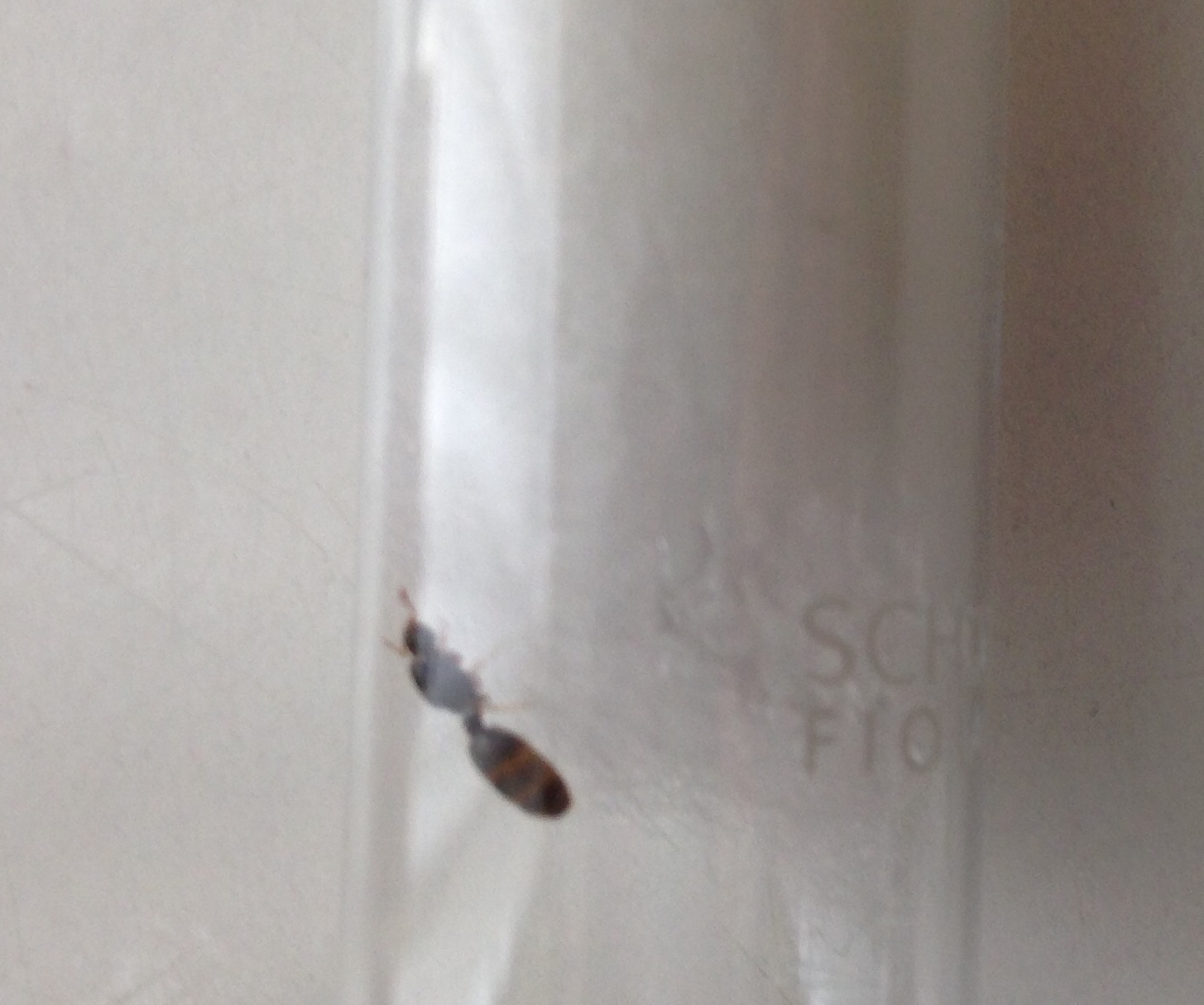 Als Anfänger achte bitte drauf, dass nicht gleich ein riesen Klecks Honig angeboten wird. Ich tippe mit einer Nadel den Glasboden so an, dass ein nicht mal stecknadelgrosser Tropfen zurück bleibt. Gerade frisch geschlüpfte Lasius niger Pygmän bleiben nur zu gerne dran kleben wenn es zuviel ist - sie ersaufen schlichtweg darin. Jedenfalls trinken die Gynen den Tropfen meist recht schnell weg, was wieder eine Zeit reichen sollte. Im Durchschnitt füttere ich ab da alle 3-4 Wochen etwas hinzu. Ich gebe auch mal eine kleine Essigfliege dazu (bis in die Mitte geschoben zwischen Nesteingang und Gyne), nehme diese am spätestens 24h später wieder raus wenn sie sie NICHT genommen hat! Genauso entferne ich Honigreste mit einem feuchten Wattetupfer - und reinige auch gleich den Untergrund von den Exkrementen (kleine schwarze Punkte). Sie reagieren recht unterschiedlich auf zugegebene Nahrung. Meine Formica haben in der Gründungsphase (hier nehm ich dann kleine Stubenfliegen) die "Beute" umgehend genommen und zerlegt. Es ist erstaunlich das in manchen Fällen so gut wie nichts übrigbleibt!