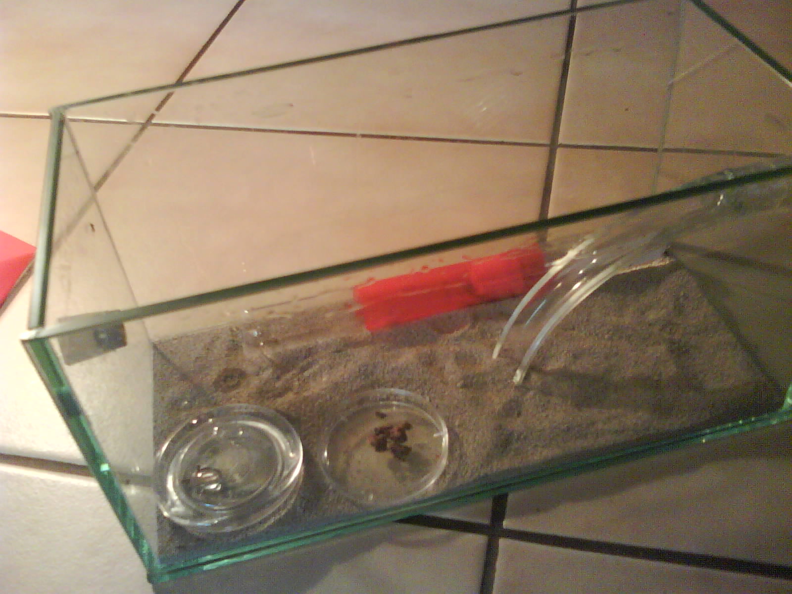 so hab gestern meine bestellung bekommen, Alpha Ants Starter Set - A, Broschüre: Grundlagen der Ameisenhaltung, Lasius niger, Napf "rund" 30mm, Zucker-Honiglösung 100ml, gefriergetrocknete Grillen 18,5g, alles war in sehr gutem zustand verpackt und die tiere waren alle am leben. ich bestellte 1 königin+11-25 arbeiterinnen bekommen hab ich 1königin mit 15 arbeiterinnen + einen haufen larven. hab auch gleich alles zusammengebaut und die kleinen scheisser reingelegt in ihrem röhrchen. sie haben auch sofort angefangen sand in das trasportröhrchen reinzutragen und haben die eier zugegraben ka warum hab eh rote folie raufgemacht.