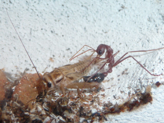 Heute beobachtet wie eine Larve das Heimchen an sich herangezogen hat.