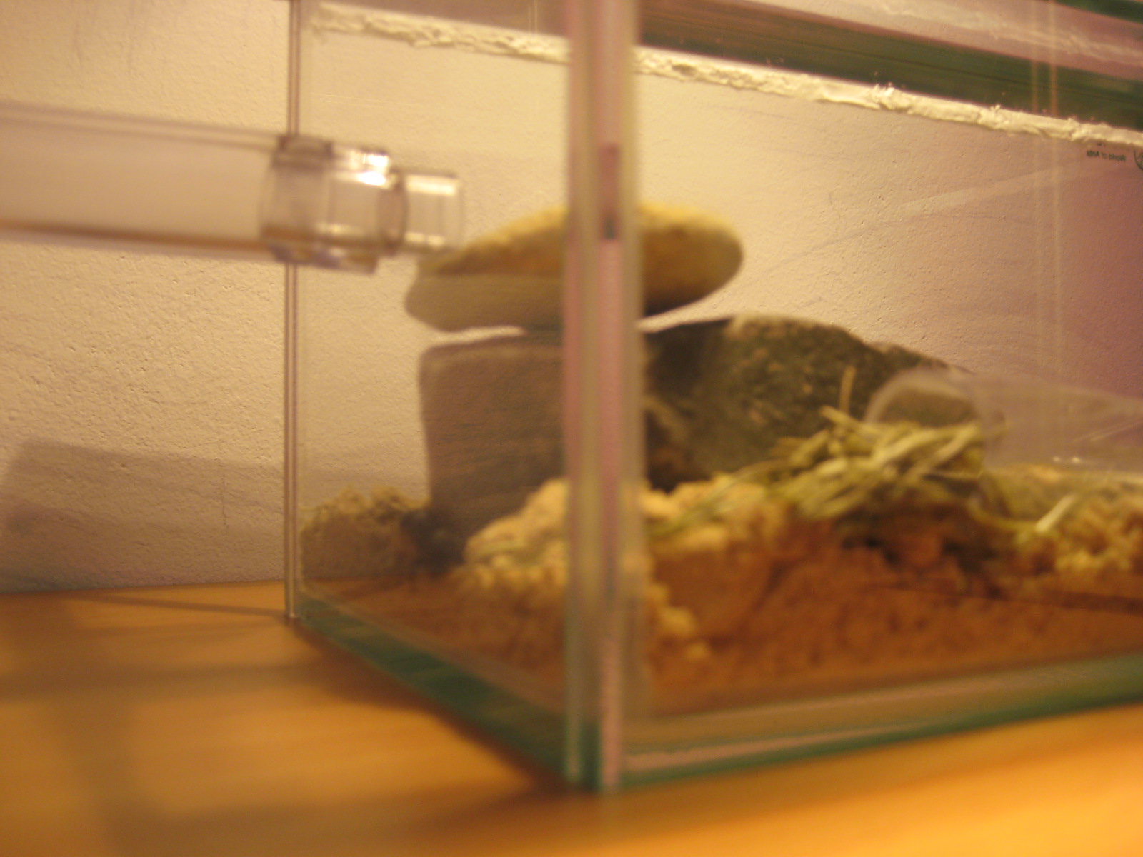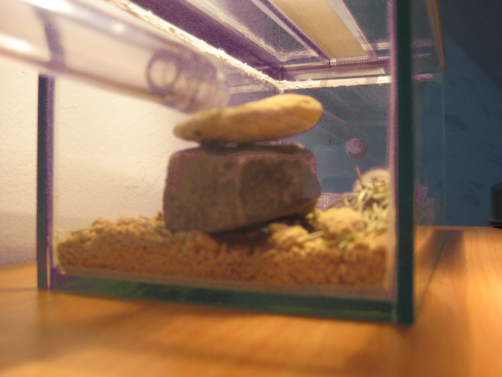 Ich machte eine Wärmelampe über der Arena an und setze sie rein. Davor tat ich noch einen Futternapf mit etwas Honiglösung in die Arena.