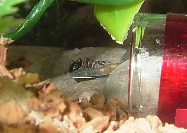 Dann gleich wieder auf die Arbeiterinnen, die wie kleine schwarze Kügelchen nebeneinander lagen. Viele Gedanken schossen mir in dem Moment durch den Kopf, alles mögliche, warum wieso weshalb - natürlich gleich noch ein Blick auf den Wassertank. In diesem war zwar nicht mehr viel drinnen aber er war nicht leer, die Watte war auch feucht, also was war passiert, zu kalt, zu warm, verhungert....