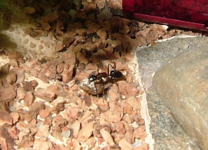 Und so wurde auch alsbald die Fliege gefunden und, wenn man bisher nur Lasius niger kannte und beobachtet hatte, versetzt es zumindest mich doch etwas in Erstaunen, daß eine einzige Arbeiterin mal eben eine ganze Stubenfliege einfach mal so mit nimmt, ohne auch nur im Ansatz irgendwelche Probleme zu haben. Im Vergleich, meine Lasius niger Pygmäen brauchten schon mindestens zwei bis drei Frauen, um eine ganze Fliege im Ansatz und mit viel Mühe in Richtung Nest zu bekommen.
