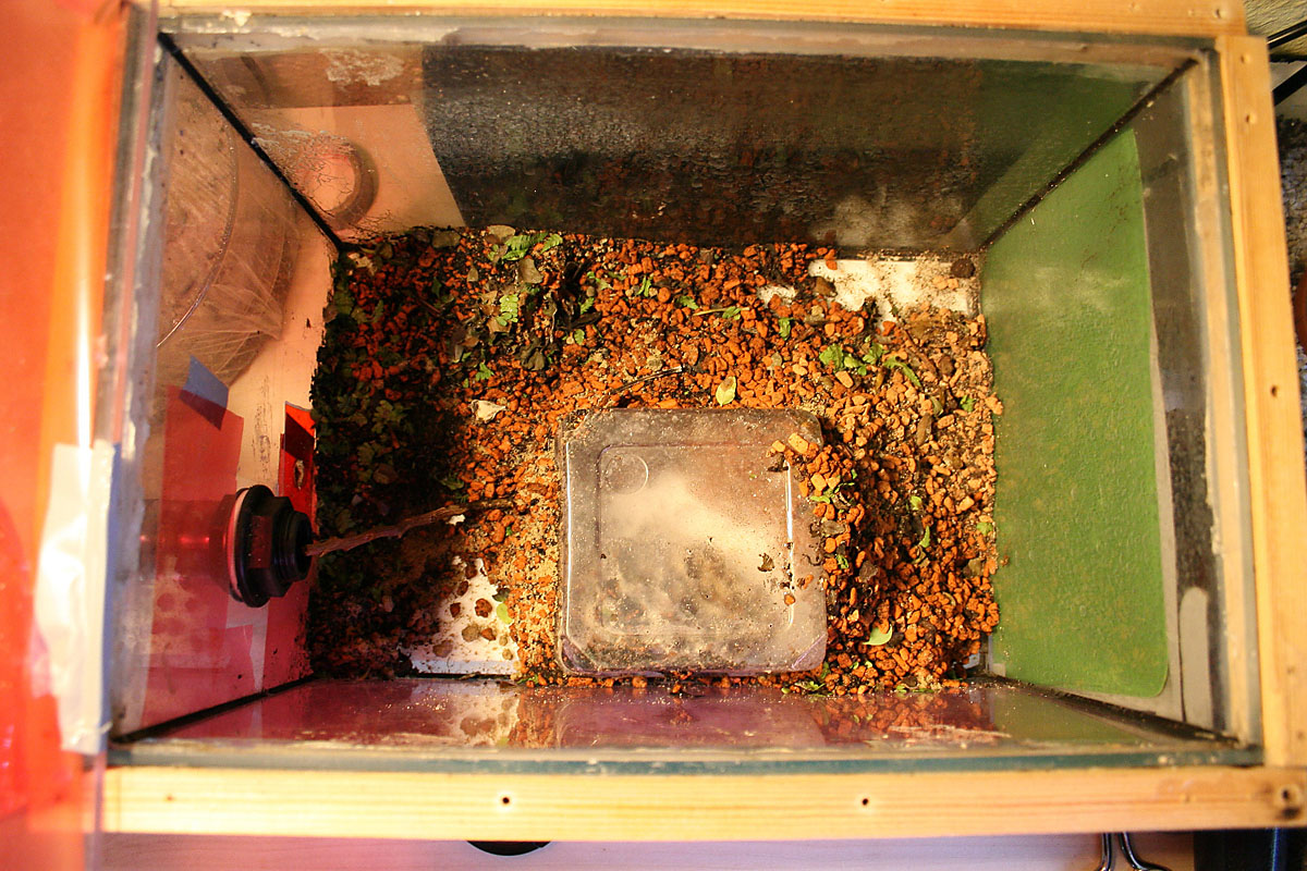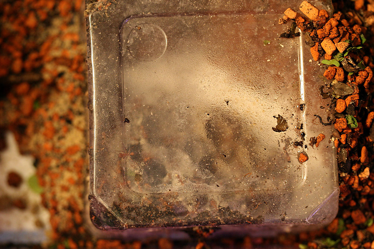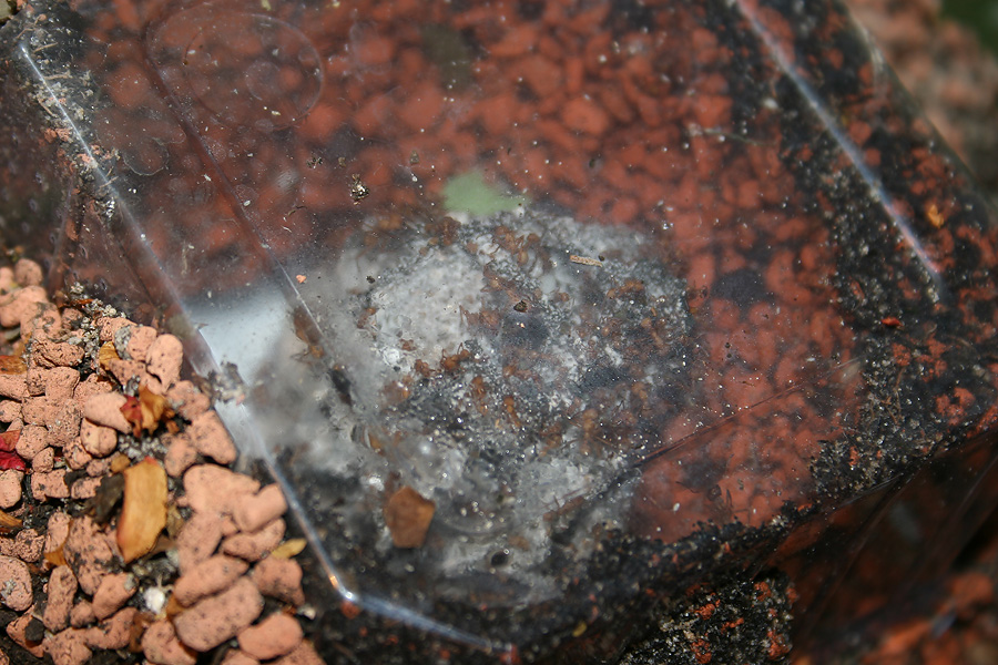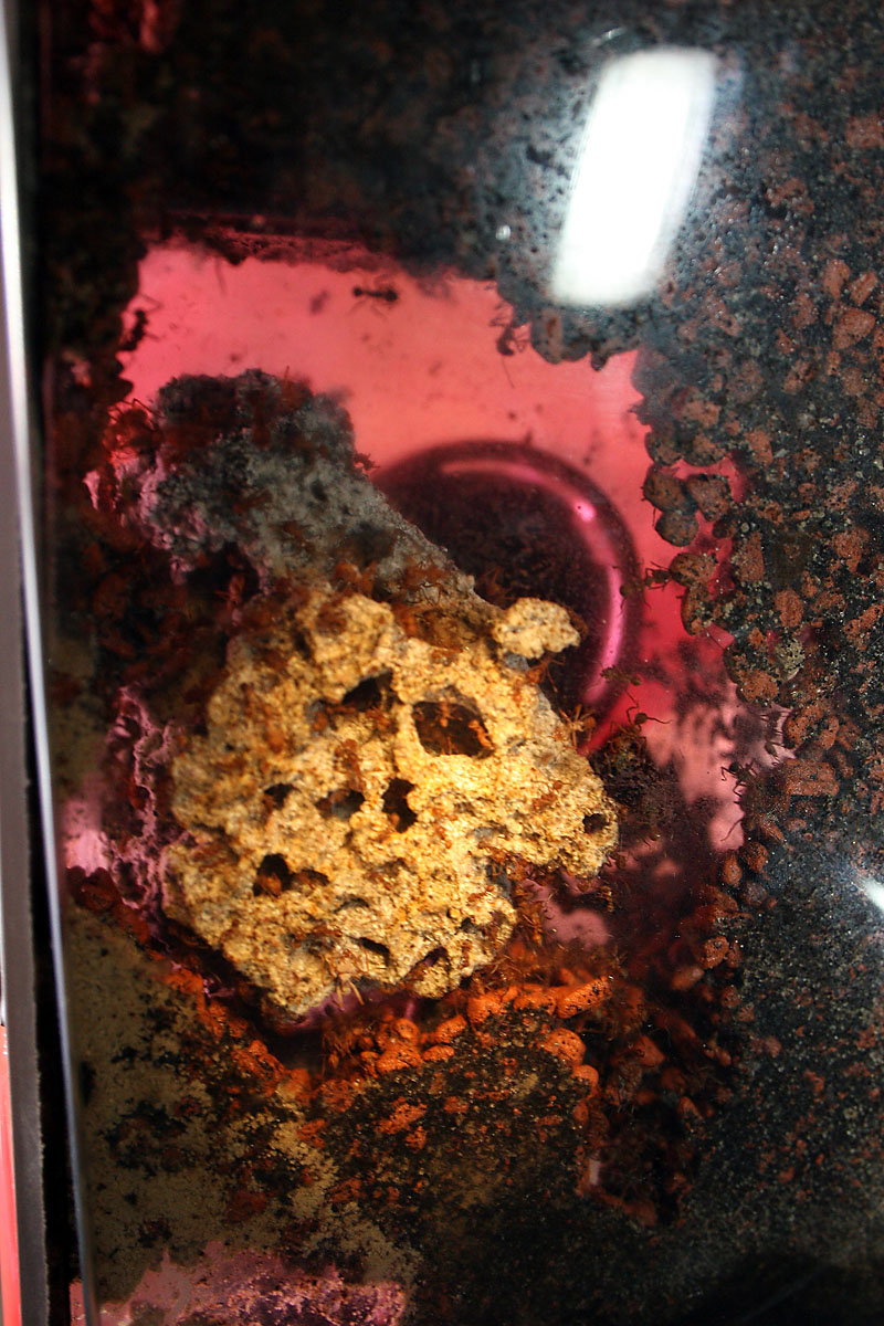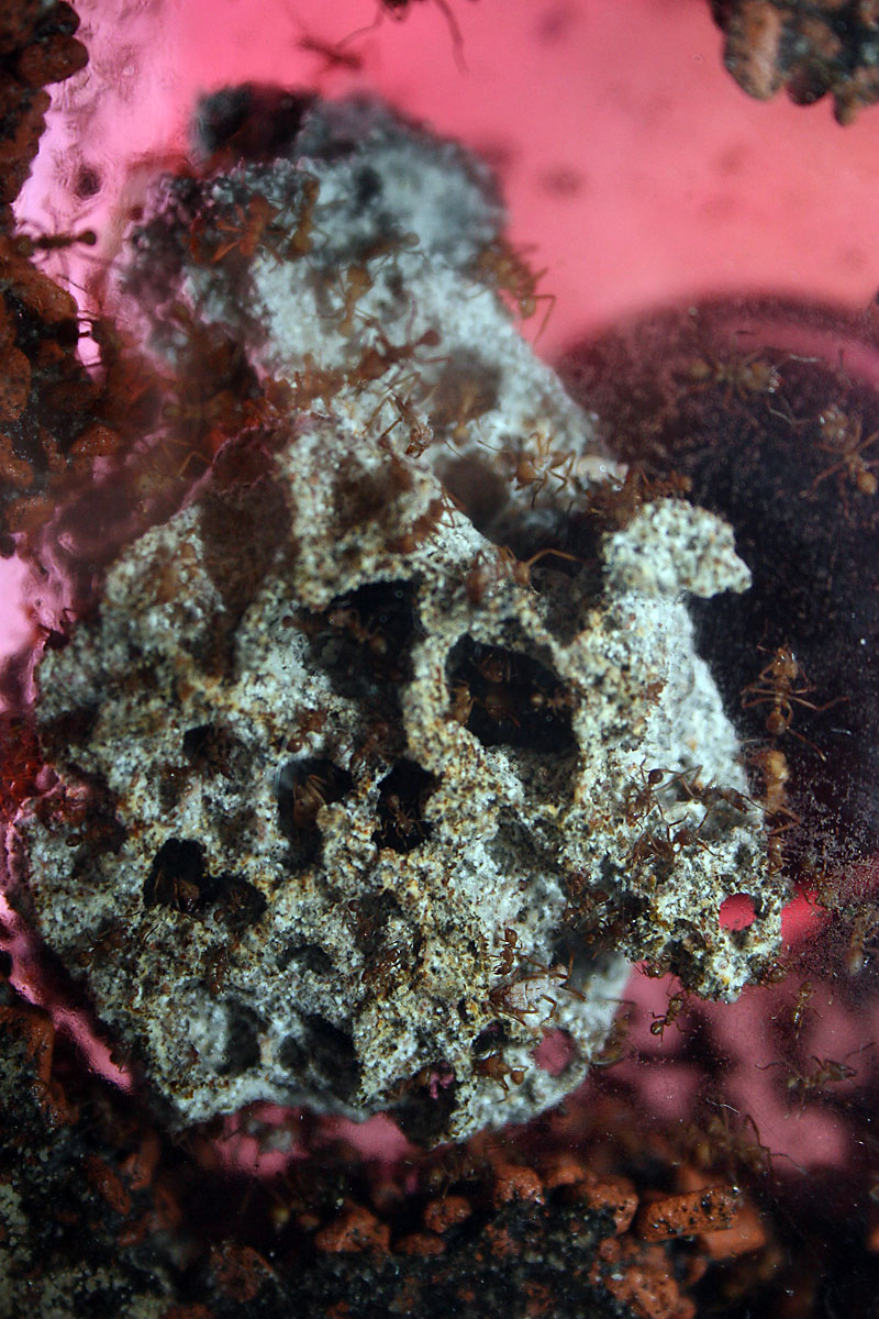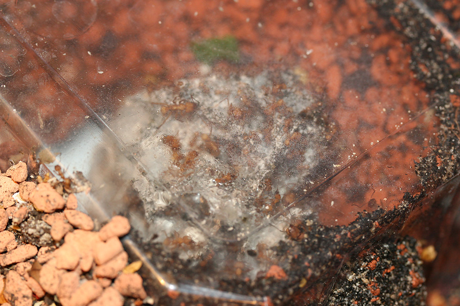 Der Pilz hat jetzt etwa ein Volumen von 500ml (ca 2-3 Heimchendosen voll) und ich denke die Kolonie nähert sich der 1000Arbeiterinnen-Grenze, was ich aber schwer abschätzen kann.