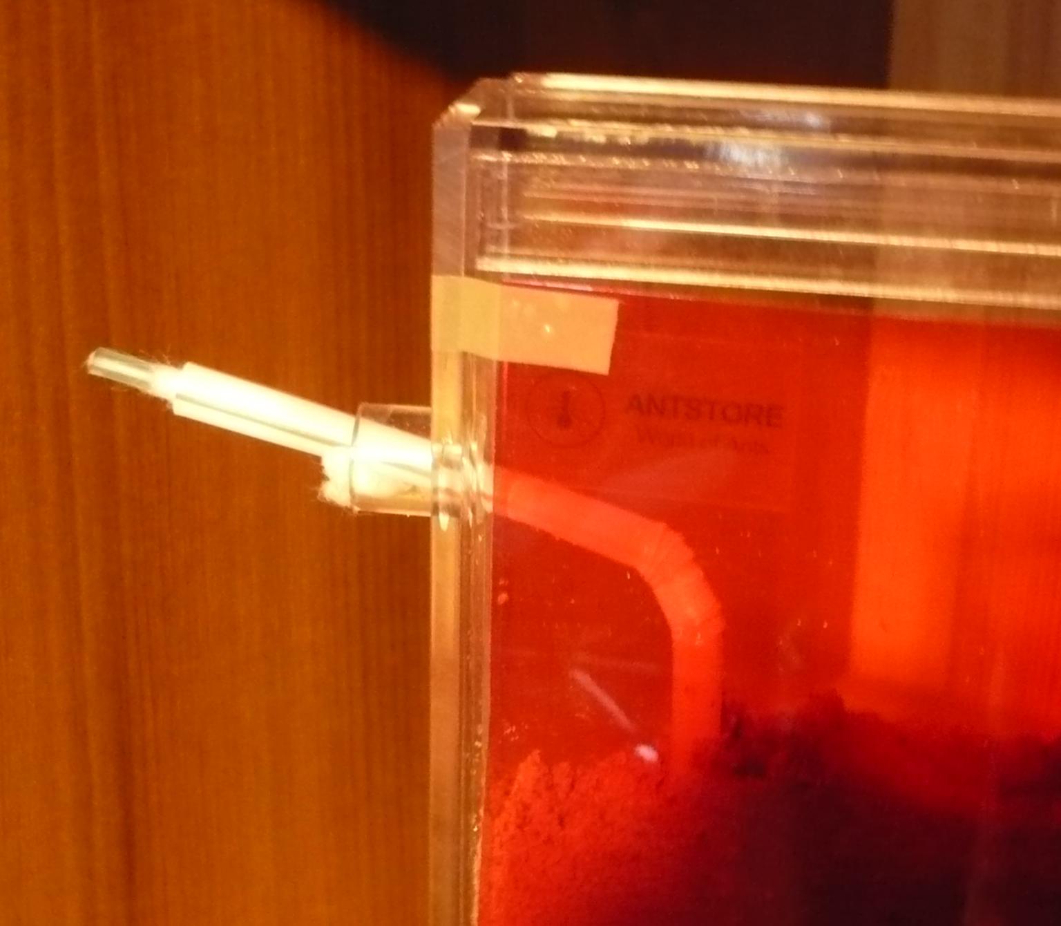 Eine Arbeiterin verläßt ständig das Reagenzglas und bewegt sich im Formicarium. Sie scheint alles ausführlich zu erkunden und läuft bis ganz nach hinten zum Einlass des Bewässerungstrohhalms.