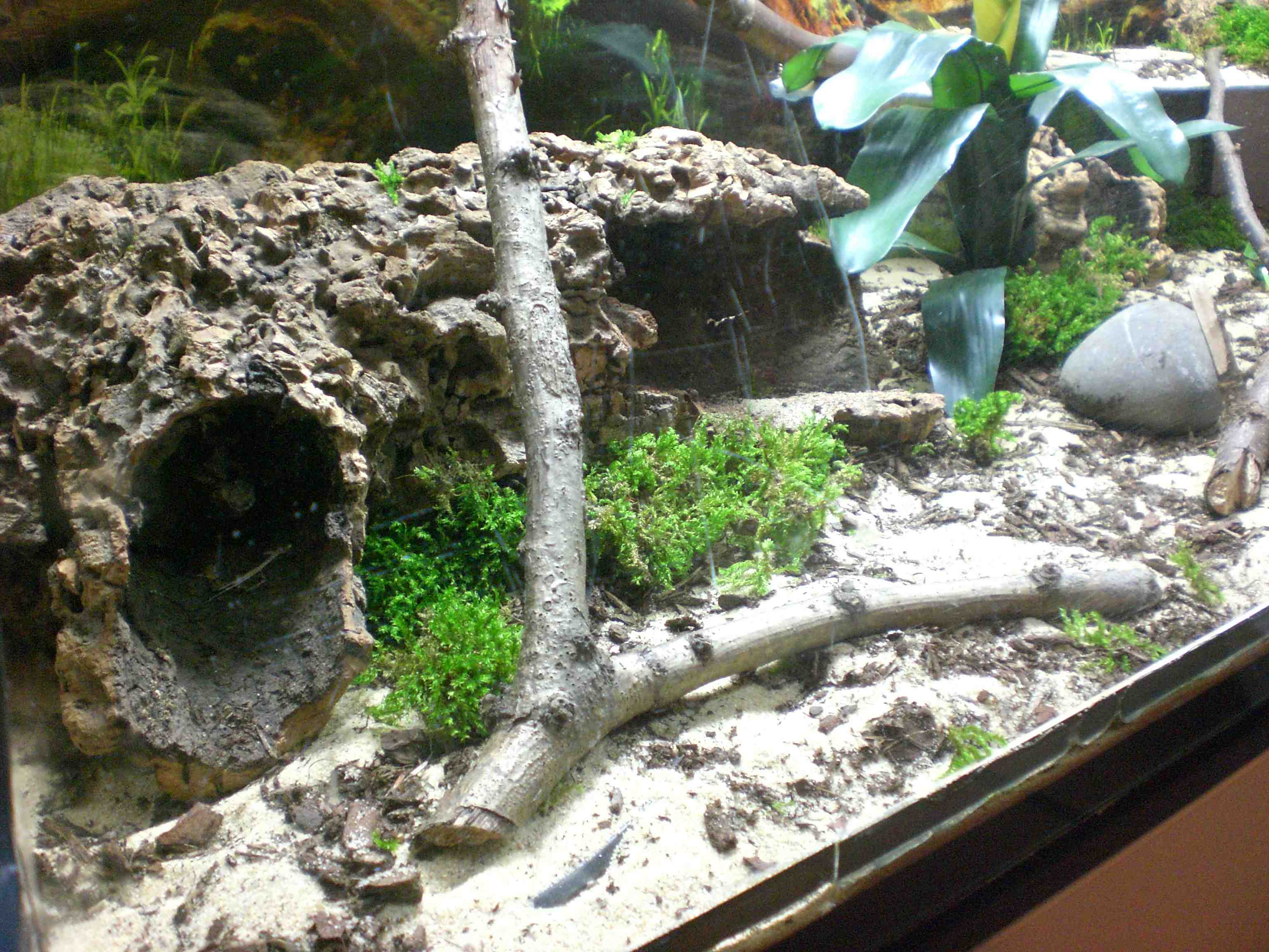 Ich habe aus Plexiglas 2 "Balkone" zugeschitten und an der Rückwand silikoniert. Die Ebenen habe ich über Äste als natürliche Treppen miteinander verbunden.