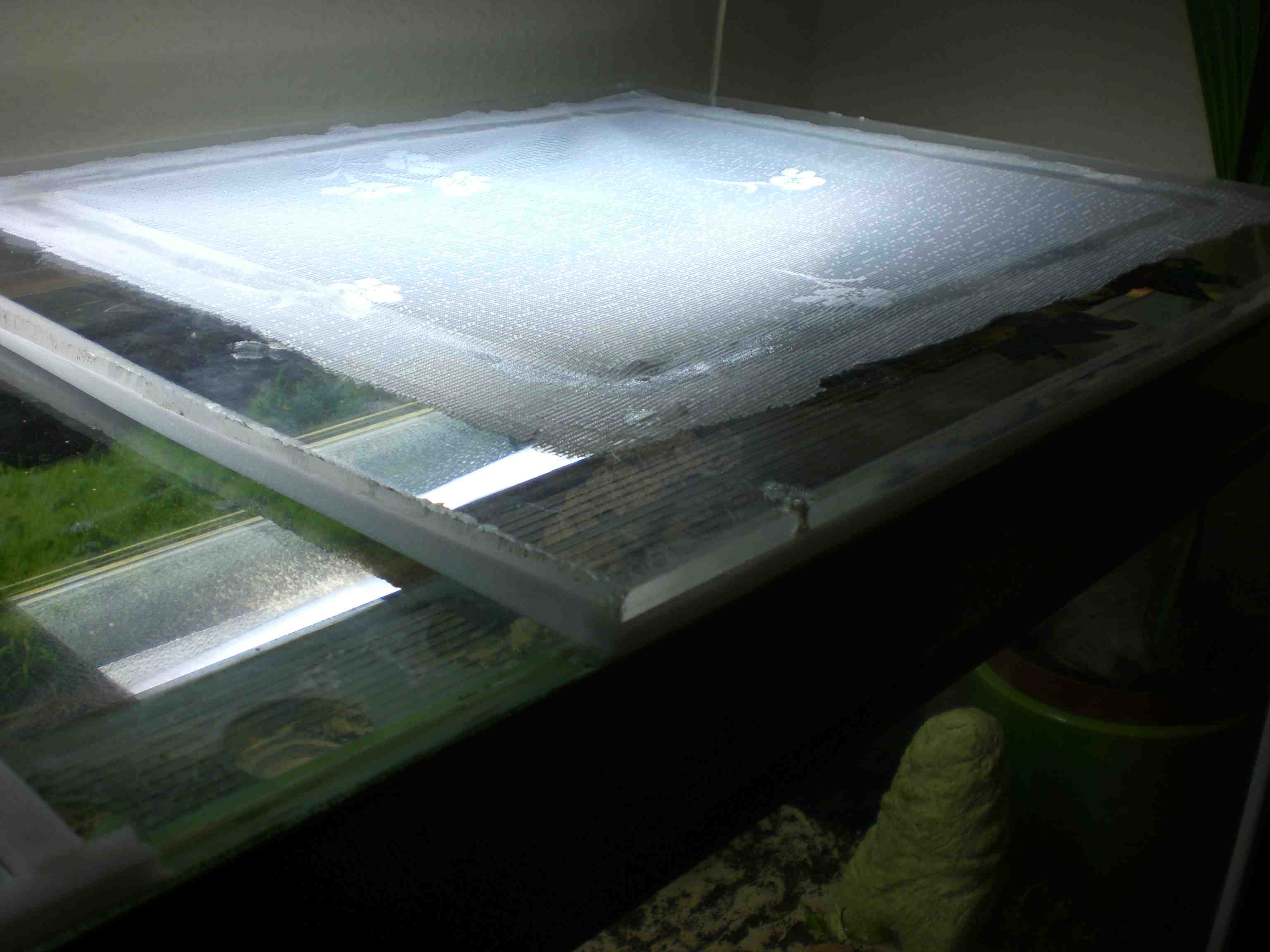 Zur Belüftung habe ich zum einen einen PC Lüfter an einem Netzteil angeschlossen und an die Wand silikoniert. Zum anderen habe ich in die Deckel jeweil ein grosses Quadrat ausgesägt und per Doppelklabeband UND Silkon eine Tischdecke(zurechtgeschnitten) drübergespannt.