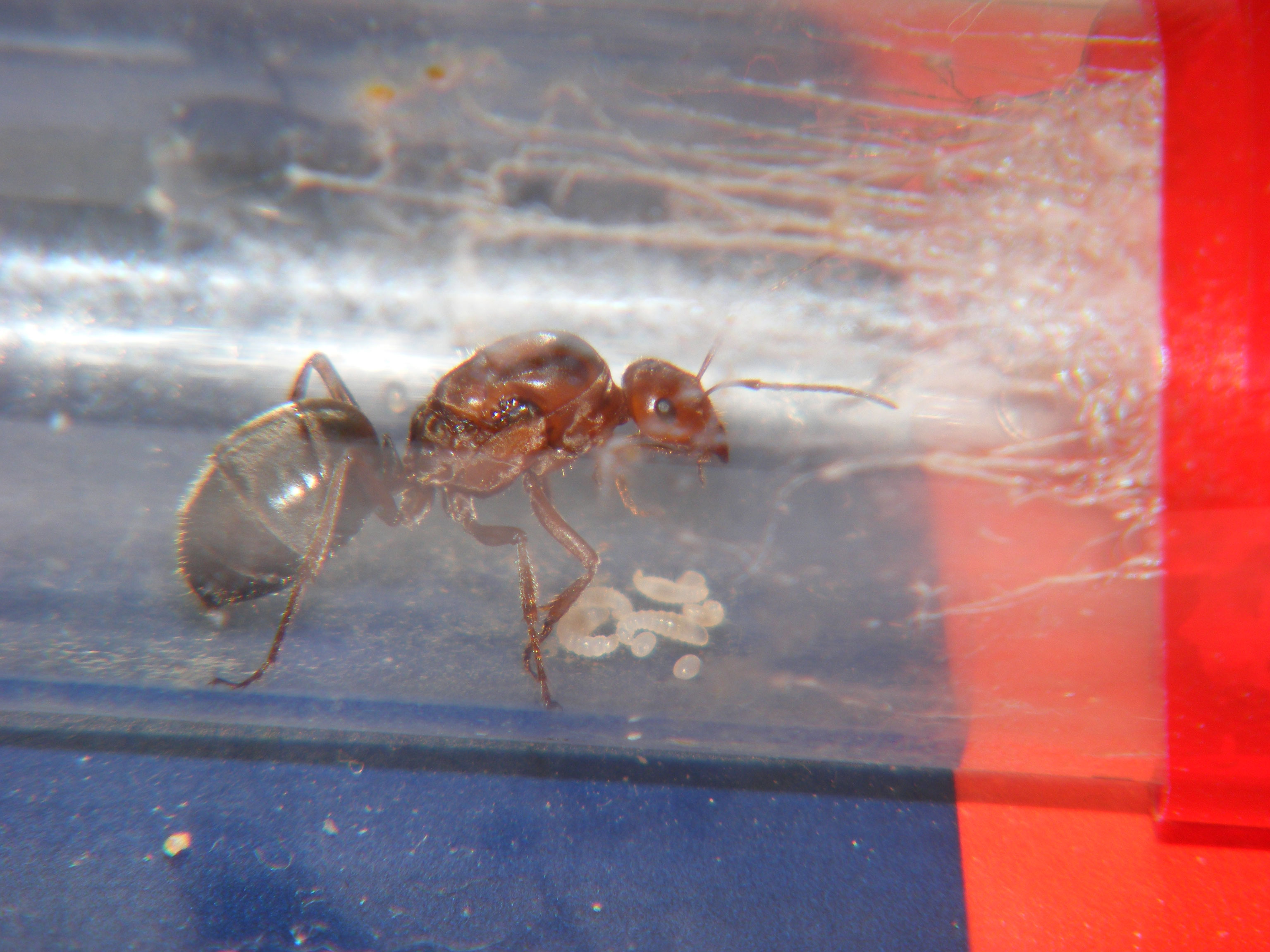 Queen Bella geht es den Umständen ganz gut. Sie sitzt die meiste Zeit in der Hauptkammer und beschützt derzeit ein einzelnes Ei, welches sie gestern Nacht gelegt hat. Die Larven, die ich gestern in das Reagenzglas gelegt habe, schienen wohl tot zu sein. Sie hat sie alle aufgefressen.