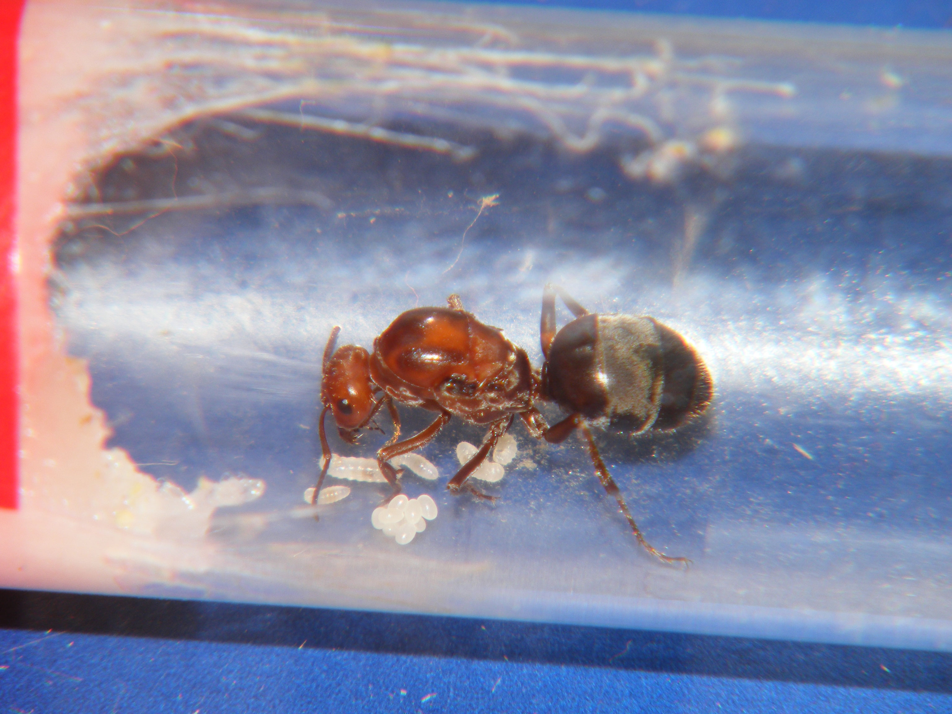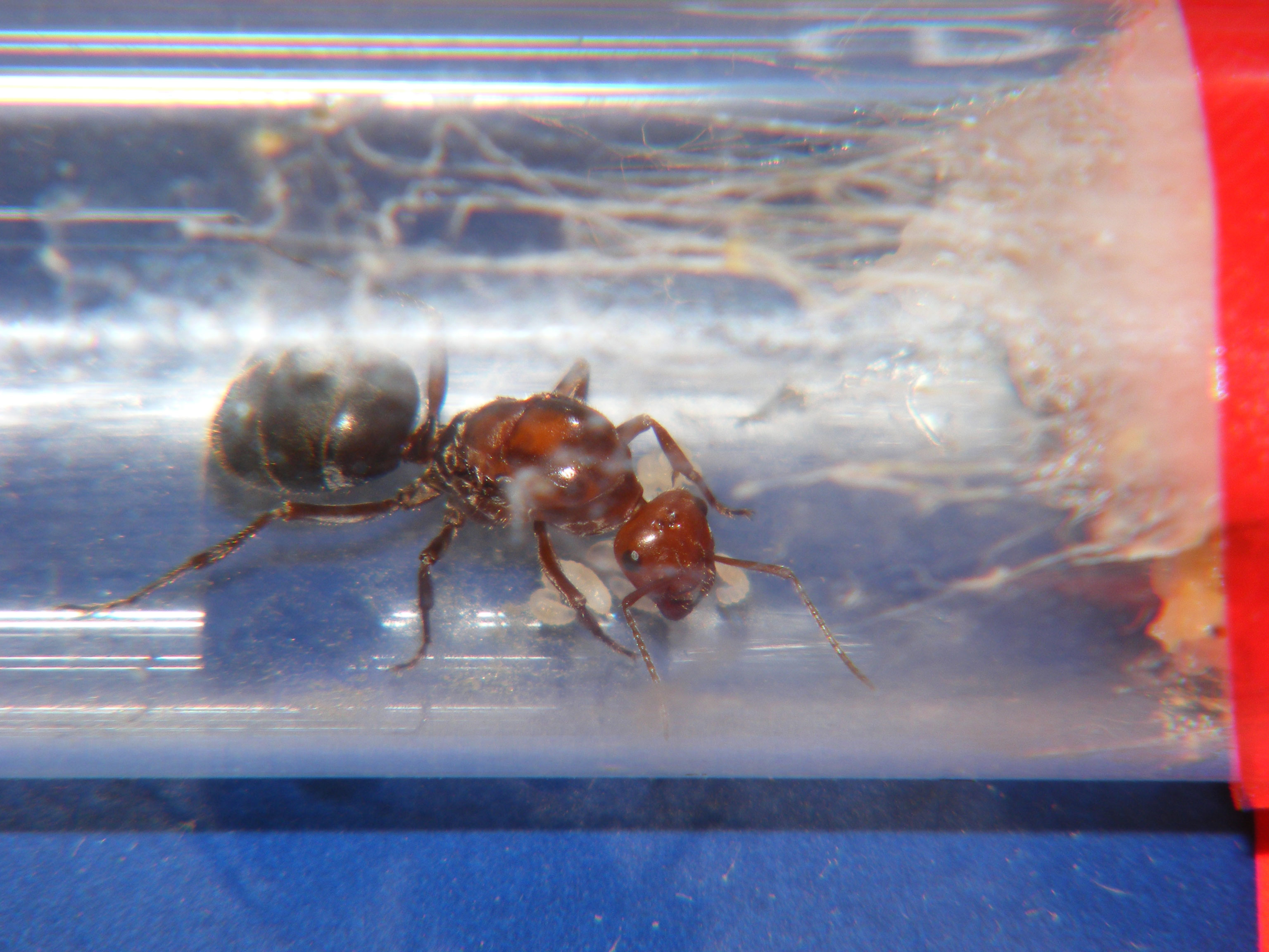Nach Nachfrage im Ameisenforum, ob Honigtopfameisenköniginnen empfindlich auf Nder Erschütteststörungen reagieren, hatte mir ein anderer Halter gesagt, dass bei ihm noch keine Eier aufgefressen wurden.