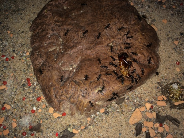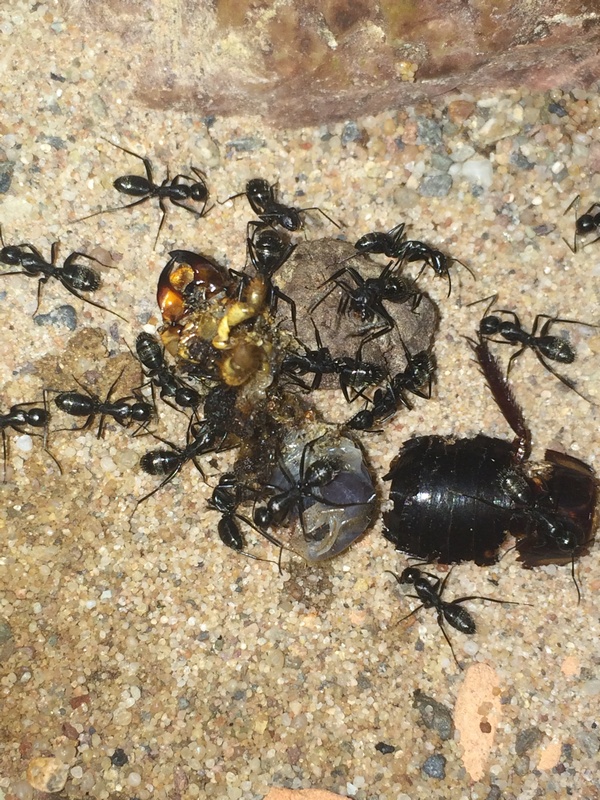 Witzig daran ist, dass dann immer 2 bis maximal 15 Ameisen für ca. 1-2 Minuten um die tote Ameise herum stehen.
